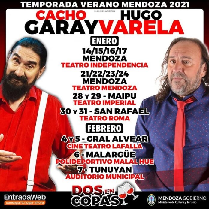 “Dos en copa”, con Hugo Varela y Cacho Garay, es un espectáculo que arranca a carcajadas desde el escenario, con el humor característico que los acompaña a lo largo de una vasta trayectoria. Seguramente el público malargüino y los turistas que nos visitan disfrutarán y agradecerán, la unión de estos dos grandes artistas populares.