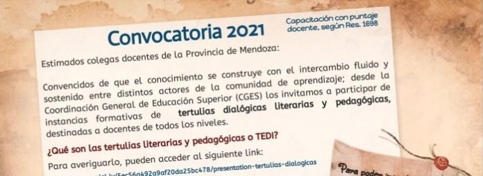 La Coordinación General de Educación Superior invita a participar en una instancia única de aprendizaje, disfrute y consenso mediante la práctica vivencial y epistemológica de las Tertulias Dialógicas Literarias y Pedagógicas (TEDI) de Mendoza, que tienen como objetivo primordial construir significados y sentidos entre los participantes.