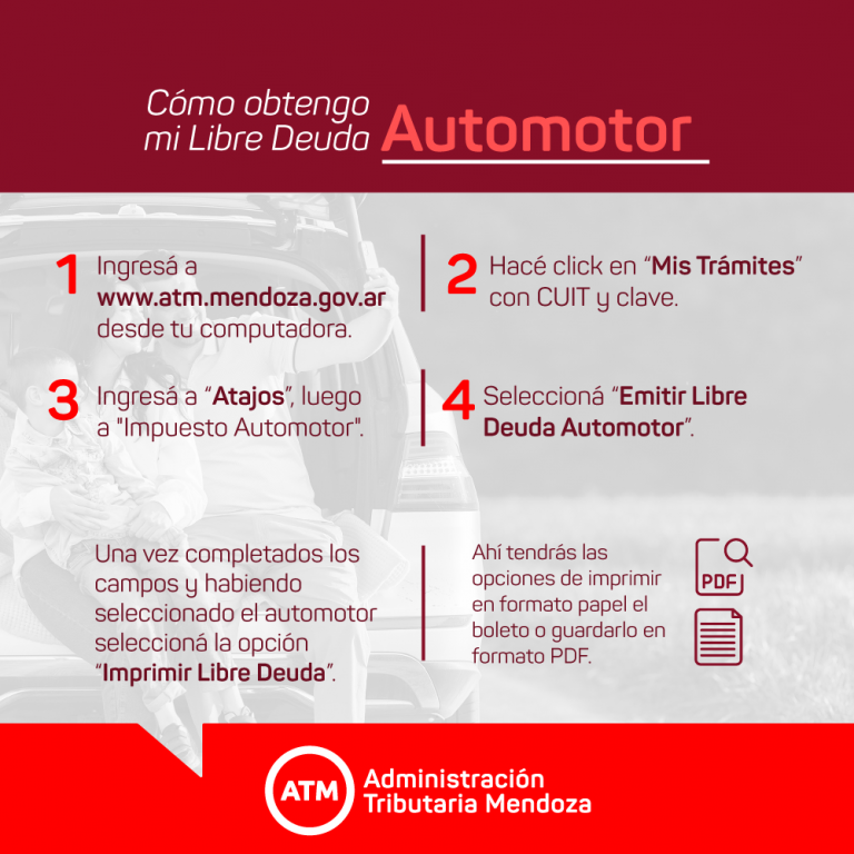 La Administración Tributaria Mendoza (ATM) informó a los contribuyentes que dentro del aplicativo de autogestión “Mis trámites” en la web www.atm.mendoza.gov.ar se puede obtener libre deuda automotor de manera simple. De esta manera, el ente recaudador continúa brindando servicios para que los ciudadanos realicen a través de internet.