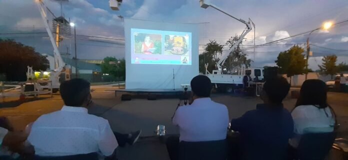 Junto al paseo de los artesanos en calle Inalican e Iriburu se ubicó una pantalla gigante para poder apreciar la nueva edición de la Fiesta nacional de la vendimia.
