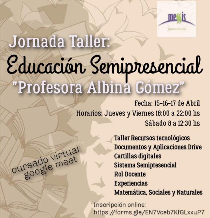 La Asociación Sociocultural Messis, junto al IES N 9-018, ha organizado una Jornada Taller sobre Educación Semipresencial para los días 15, 16 y 17 de abril próximos. En la misma se hará un homenaje a la Profesora Albina Gómez, una destacada docente de nuestro medio y miembro de la Asociación Messis. Ella falleció en diciembre de 2020.