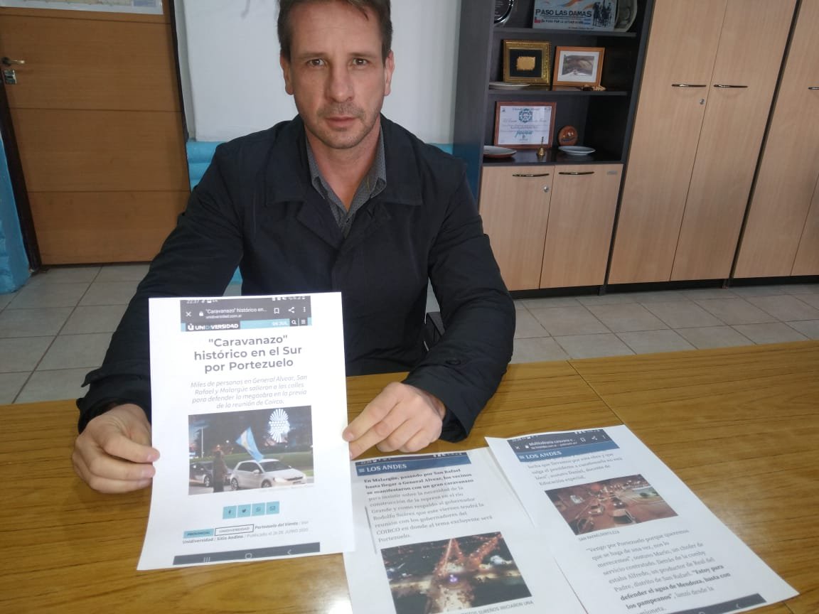 “Desde hace tiempo se escucha hablar de Portezuelo del Viento y, si hacemos un poco de historia reciente, a Malargüe lo visitaron empresarios de toda la provincia, entidades, cámaras de comercio, intermedias y sectoriales aplaudiendo el avance de Portezuelo en cuanto a su concreción licitatoria. Hoy esas mismas personas hablan de Portezuelo de una manera contraria, donde como ustedes saben el día 9 de julio, pasado mañana, en Alvear habrá un corte de ruta en contra de Portezuelo del Viento. Justo un año después que esas mismas personas protagonizaron un caravanazo en apoyo a Portezuelo del Viento, y en mis manos tengo las pruebas de portadas de diferentes medios de comunicación que cubrieron esa convocatoria histórica” afirmó Miras, munido de impresiones de las páginas de los medios que publicaron la noticia.