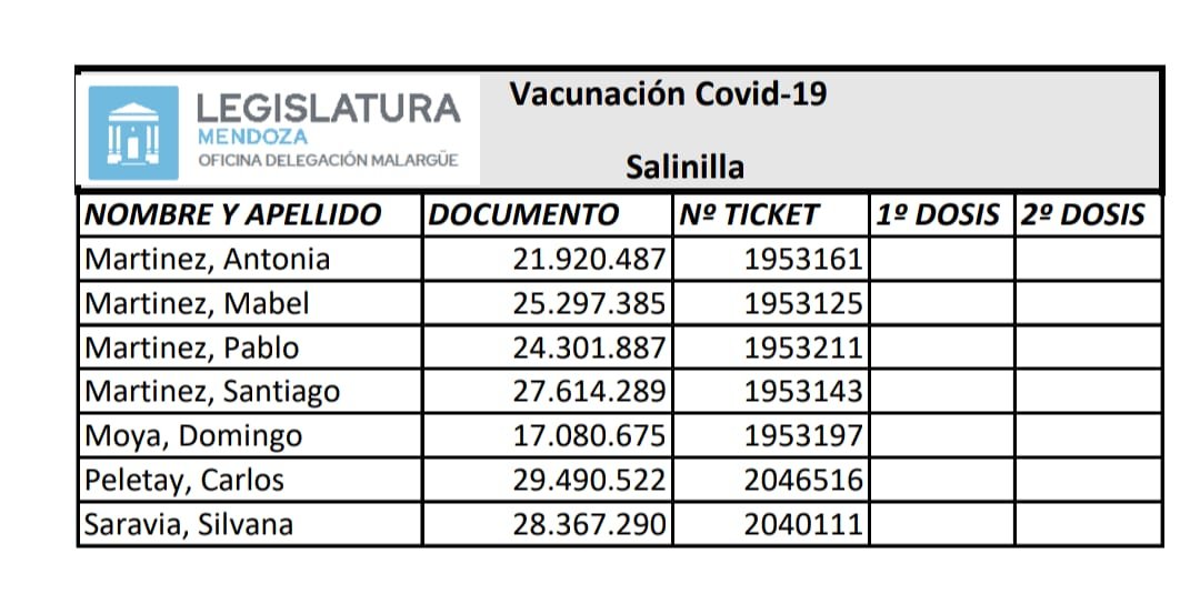 El Área Sanitaria Malargüe, en conjunto con la Oficina de la Legislatura-Sede Malargüe, informa que hoy, lunes 12 de julio, estarán realizando vacunación a los vecinos que hasta el día de hoy tienen turnos habilitados y figuran en las siguientes listas: