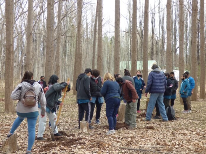 Acompañados por sus docentes y personal de la Delegación, plantaron 40 ejemplares de álamos criollos en el cuadro Nº14 de ensayo silvo-pastoril a fin de reforzar conocimientos teóricos del aula y la observación de los procesos en el campo real.