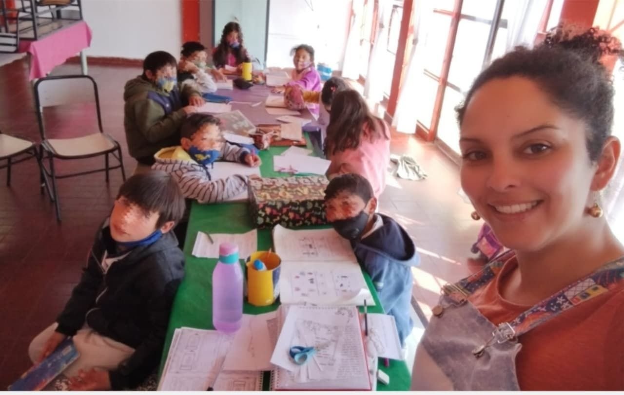 La docente Soledad Baigorria tiene a cargo el aula con 12 alumnos de la escuela Petroleros del Sur quienes ocupan el edificio escolar para recibir sus clases de apoyo.