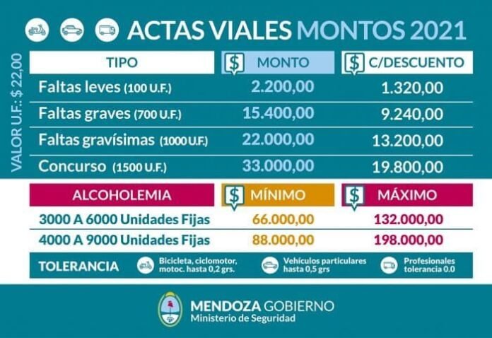 Las multas leves cuestan 2.200 pesos (100 UF); las graves, 15.400 (700 UF); las gravísimas, 22.000 pesos (1.000 UF) y el concurso -cuando el conductor comete dos o más faltas- tiene un valor de 33.000 pesos (1.500 UF).