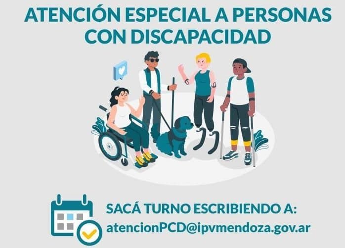 Esta atención especializada se realizará los lunes y martes de 8 a 13.30. Quienes deseen reservar un turno pueden hacerlo escribiendo a atencionPCD@ipvmendoza.gov.ar. También se atenderá la demanda espontánea de estos casos, en los días y horarios previstos, priorizando a quienes ya posean turno.
