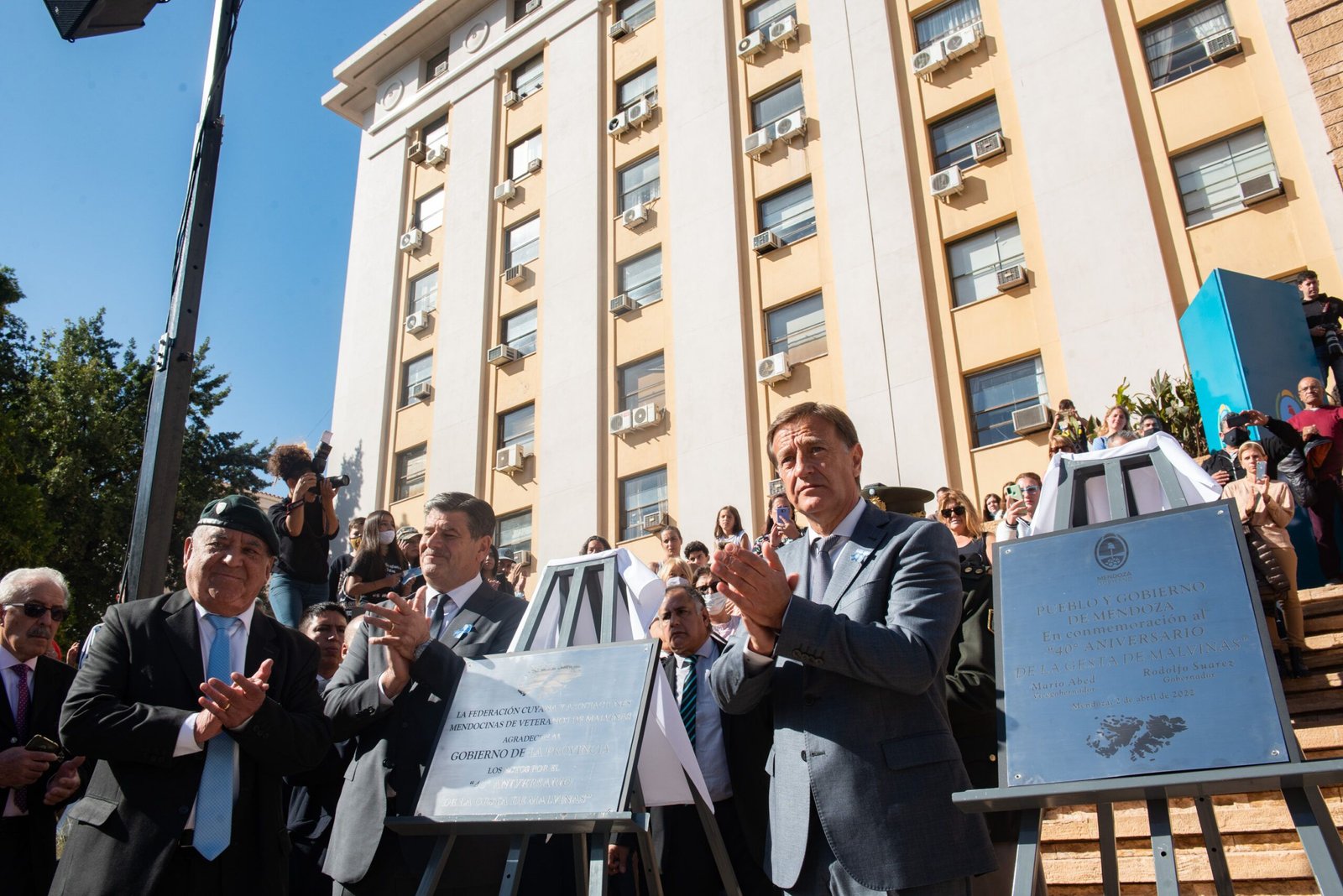 A continuación, el Gobernador, el vicegobernador; el intendente de la Ciudad, Ulpiano Suarez; la ministra de Cultura y Turismo, Nora Vicario, y el presidente de la Federación Cuyana de Veteranos realizaron el descubrimiento de placas en homenaje a los 15 mendocinos fallecidos en combate.