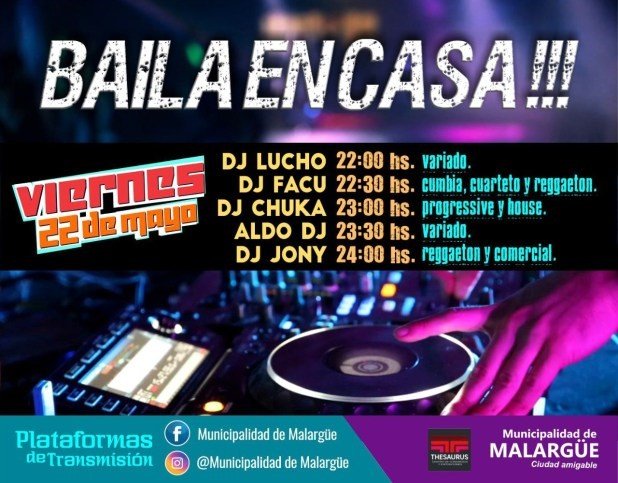 Desde la dirección de Eventos e Infraestructura Turística se presentó esta iniciativa de llevar música festiva a las casas de Malargüe, para que todos bailen y disfruten con la transmisión en vivo de los mejores DJs del medio. Cada viernes de 22:00 a 01:00–mientras dure la cuarentena- 5 DJ malargüinos transmitirán su música mediante la página de Facebook y el Instagram oficiales del municipio, como así también por la FM 94.5 Municipal.