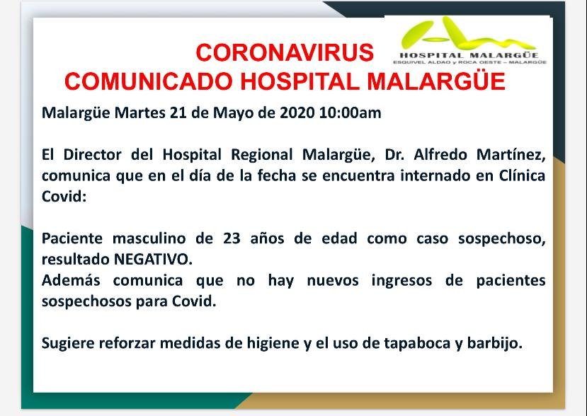 El Director del hospital Malargüe, Dr. Alfredo Martínez, informó que el paciente de 23 años ingresado como caso sospechoso para COVID-19 dio negativo.