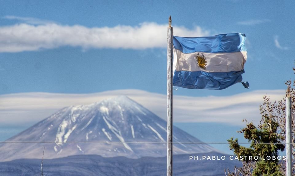 El aplauso del día, ilustrado con esta foto de la bandera argentina que tiene de fondo del volcán El Payén (obra del artista Pablo Castro Lobos) es para todos los malargüinos que con mucho sacrificio están cumpliendo la cuarentena impuesta desde el gobierno nacional.