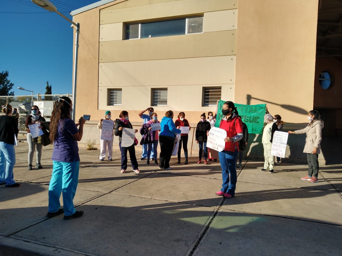 Algunos de los carteles decían «todo el personal de la salud merece un salario digno»; «Contratados y prestadores expuesto a COVID por $ 12.000; «Pase a planta ya»; «Seguimos sin cobertura y expuestos».