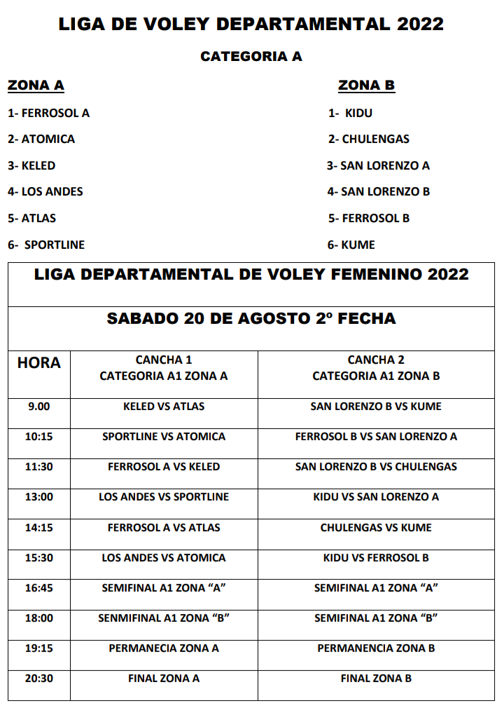 Continúa la acción en el voley femenino departamental con la segunda fecha este sábado y domingo con encuentros desde las 9:00 horas y hasta las 20:30 de cada día respectivamente en canchas del Polideportivo Municipal.