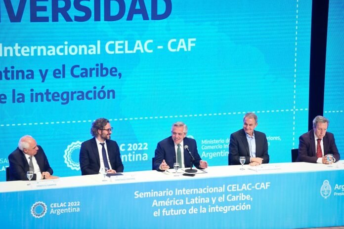El presidente Alberto Fernández, en su rol de líder pro témpore de la Comunidad de Estados Latinoamericanos y Caribeños (Celac), llamó hoy a “institucionalizar” al organismo y pidió “terminar” con los bloqueos sobre Cuba y Venezuela, durante el cierre del seminario internacional “El futuro de la integración: Unidad en la Diversidad”, ante la presencia de los líderes latinoamericanos y del Caribe en el Centro Cultural Kirchner.