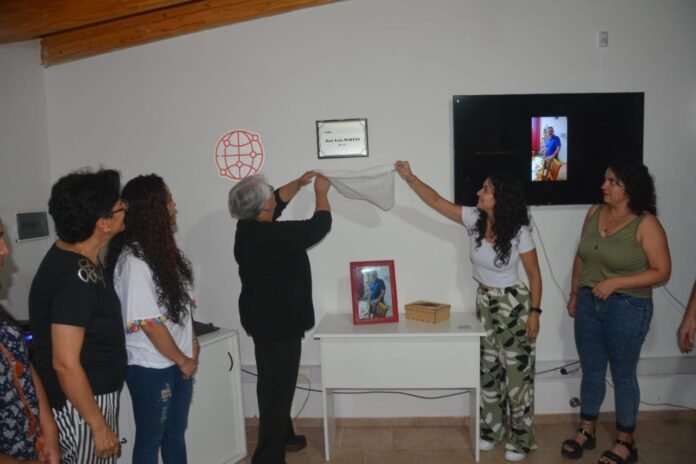 Aidé, su esposa, e hijos de José Luis Macías, a Johana Sánchez Coordinadora de punto digital Malargüe, a la directora de la Agencia de desarrollo educativo Prof. Verónica Bunsters realizaron el descubrimiento de una placa.