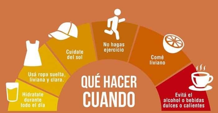 No consumir bebidas con alcohol, ya que aumentan la temperatura corporal y las pérdidas de líquido.