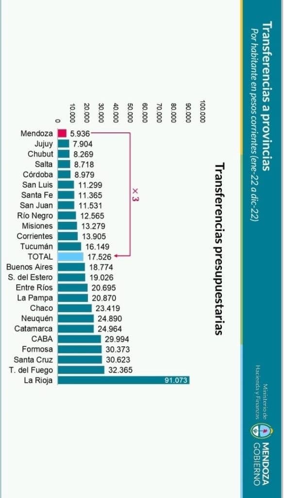 El dato que marca la disparidad entre Mendoza y otras jurisdicciones corresponde a las transferencias presupuestarias que se mide por habitante en pesos corrientes. Se trata de transferencias no automáticas, en otras palabras, que quedan por fuera de la coparticipación y, por ende, al arbitrio de las necesidades de cada lugar y de quien detente la lapicera.