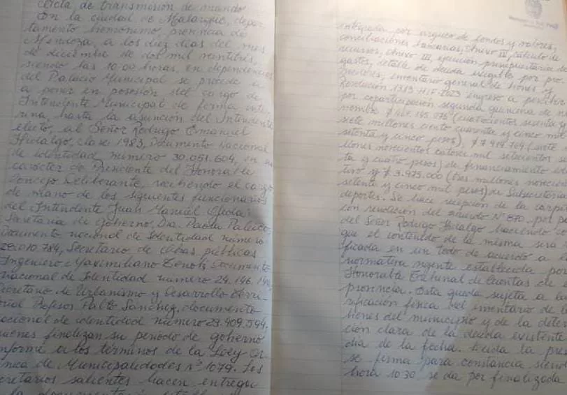 En la ciudad de Malargüe, departamento homónimo, provincia de Mendoza, a los 10 días del mes de diciembre de 2023, siendo las 10 horas, en dependencias del palacio municipal, se procede a poner en posesión del cargo de intendente municipal, de forma interina hasta la Asunción del intendente electo, al Señor Rodrigo Emmanuel Hidalgo en su carácter de presidente del Honorable Concejo Deliberante recibiendo el cargo de mano de los siguientes funcionarios del intendente Juan Manuel Ojeda: Secretaria de gobierno Paola Paleico, Secretario de obras públicas ingeniero Maximiliano Zenobi, Secretario de urbanismo y desarrollo territorial, Pablo Sánchez, quienes finalizan su periodo de gobierno conforme a los términos de la ley orgánica de municipalidades 1079. Los secretarios salientes hacen entrega de la documentación establecida en el anexo 870 del Honorable tribunal de cuentas, integrada por arqueo de fondos y valores conciliaciones bancarias, anexo IV, cálculo de recursos, anexo III, ejecución presupuestaria de gastos, detalles de deuda exigible por proveedores, inventario general de bienes y resolución 1313/23. Ingreso a percibir por coparticipación segunda quincena de noviembre $ 467.145.075; $ 7.914.764 de financiamiento educativo y $ 3.975.000 de Subsecretaría de deportes. Se hace recepción de la carpeta con rendición del acuerdo 870 por parte del señor Rodrigo Hidalgo, haciendo constar que el contenido de la misma será verificado en un todo acuerdo a la normativa vigente establecida por el Honorable tribunal de cuentas de esta provincia. Esta queda sujeta a la verificación física del inventario de los bienes de municipio y de la determinación clara de la deuda existente al día de la fecha. Se firma para constancia, siendo la hora 10:30 se da por finalizada el acto”.