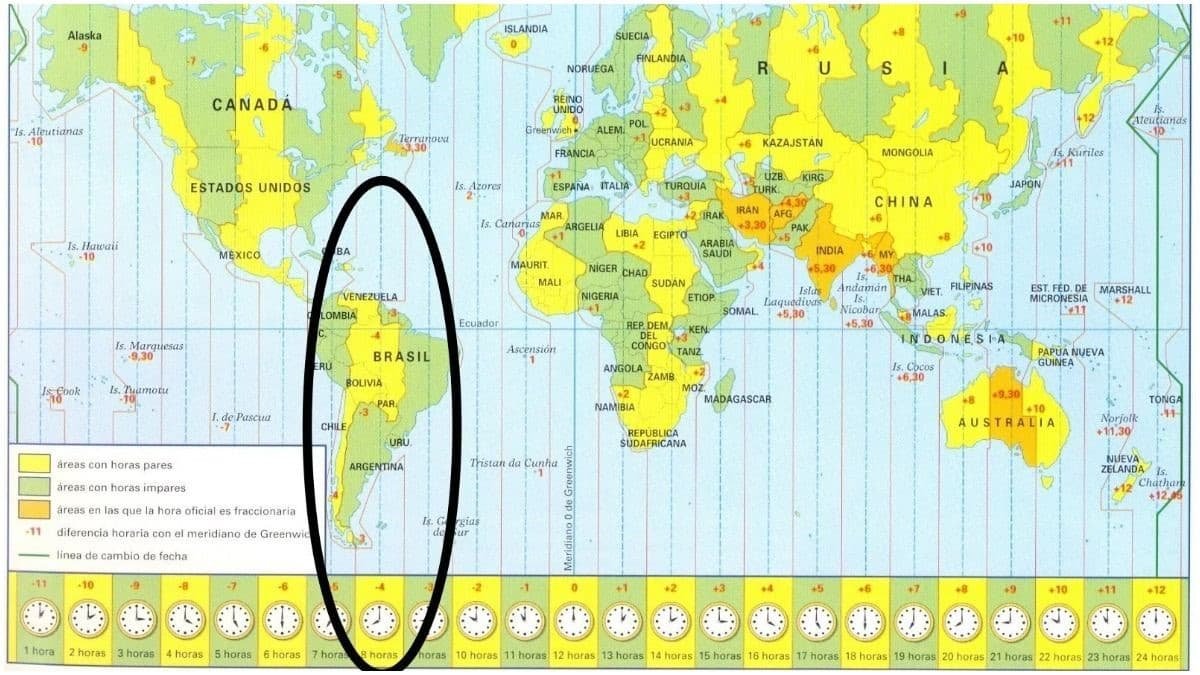 Argentina -añadió el legislador- «se encuentra casi en su totalidad dentro del huso horario de 4 horas al Oeste de Greenwich, solamente la zona cordillerana ingresa en el huso -5; sin embargo usamos la hora del huso -3. Además, parte de Brasil, Paraguay, Bolivia, Venezuela y Chile, hoy están en el huso -4»