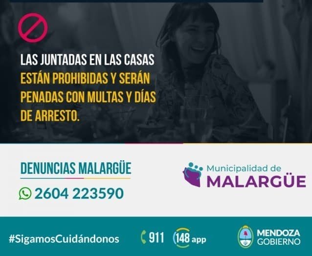 A raíz de ello, el gobierno de Mendoza lanzó la campaña “Los amigos siempre están, hoy es momento de cuidarnos”, advirtiendo que las juntadas en las casas están prohibidas y serán penadas con multas y días de arresto. En casos de detectar una reunión ilegal se podrá denunciar al 911, pero además cada municipio de la provincia tendrá un número de whatsapp que permitirá descomprimir el contacto de emergencia.