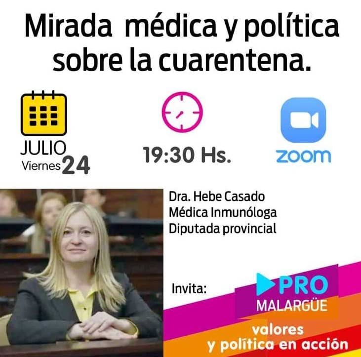 Hoy, viernes 24 de julio, a las 19:30, la médica inmunóloga y diputada provincial por el sur provincial, Dra. Hebe Casado, ofrecerá una charla virtual titulada “mirada médica y política sobre la cuarentena”.