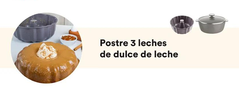 - Mezclar la crema de leche, la leche evaporada y el dulce de leche. Volcar lentamente sobre el bizcochuelo para que absorba las tres leches.