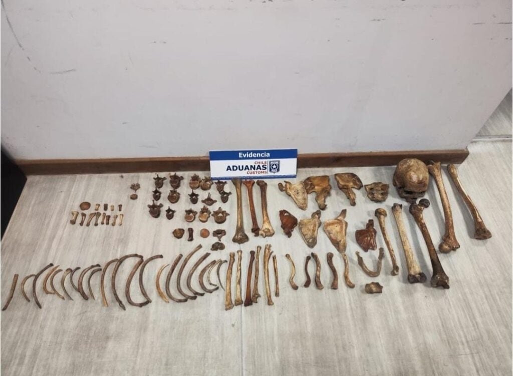 Los uniformados quedaron sorprendidos cuando revisaban un vehículo en el que encontraron dentro de una caja plástica una osamenta humana completa, según puede verse en las fotos tomadas por Aduana.