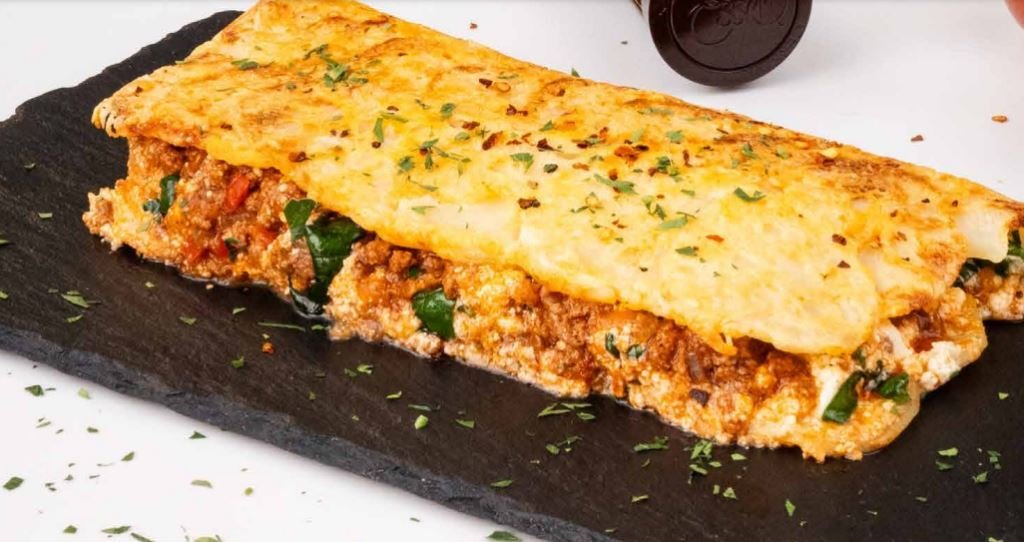 Colocar la ricota sobre la mitad de la base de papas y por encima la carne, doblar al medio