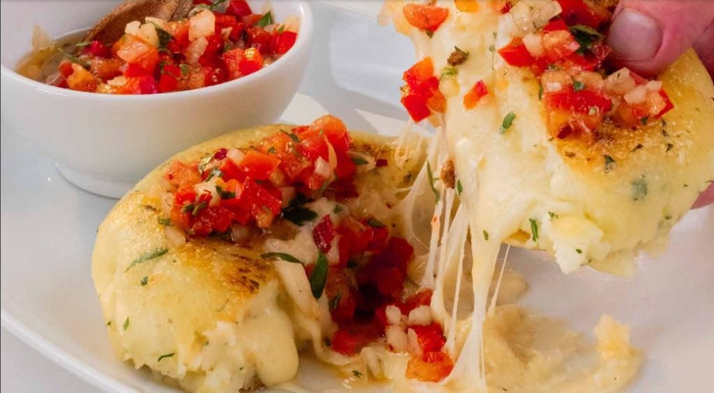 Pisar la papa cocida y realizar un puré, agregar sal, pimienta, nuez moscada, agregar cebolla de verdeo cortada bien fina. Incorporar almidón de maíz hasta lograr una masa, separar una porción presionar con las manos y colocar en el centro un disco de queso, ir cerrando con el resto de la masa de papa.