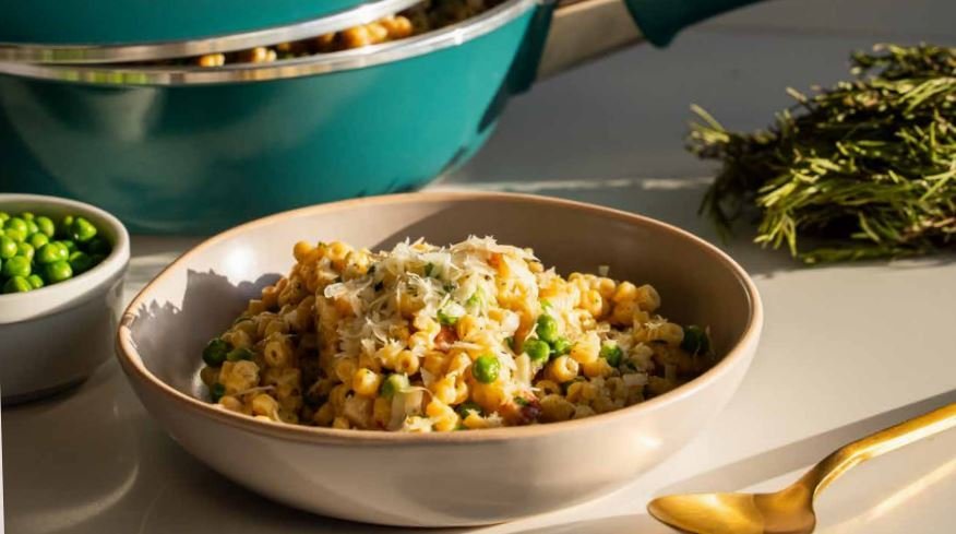 Tapar, bajar el Fuego a Mínimo y dejar cocinar hasta que se evapore todo el líquido. Incorporar las arvejas, crema de leche, las yemas, rallar el queso parmesano y agregar pimienta y perejil. Servir.