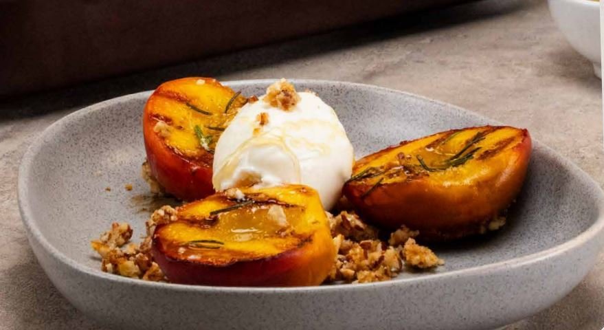 Servir los duraznos grillados, colocar el crocante y terminar con una bocha de helado.