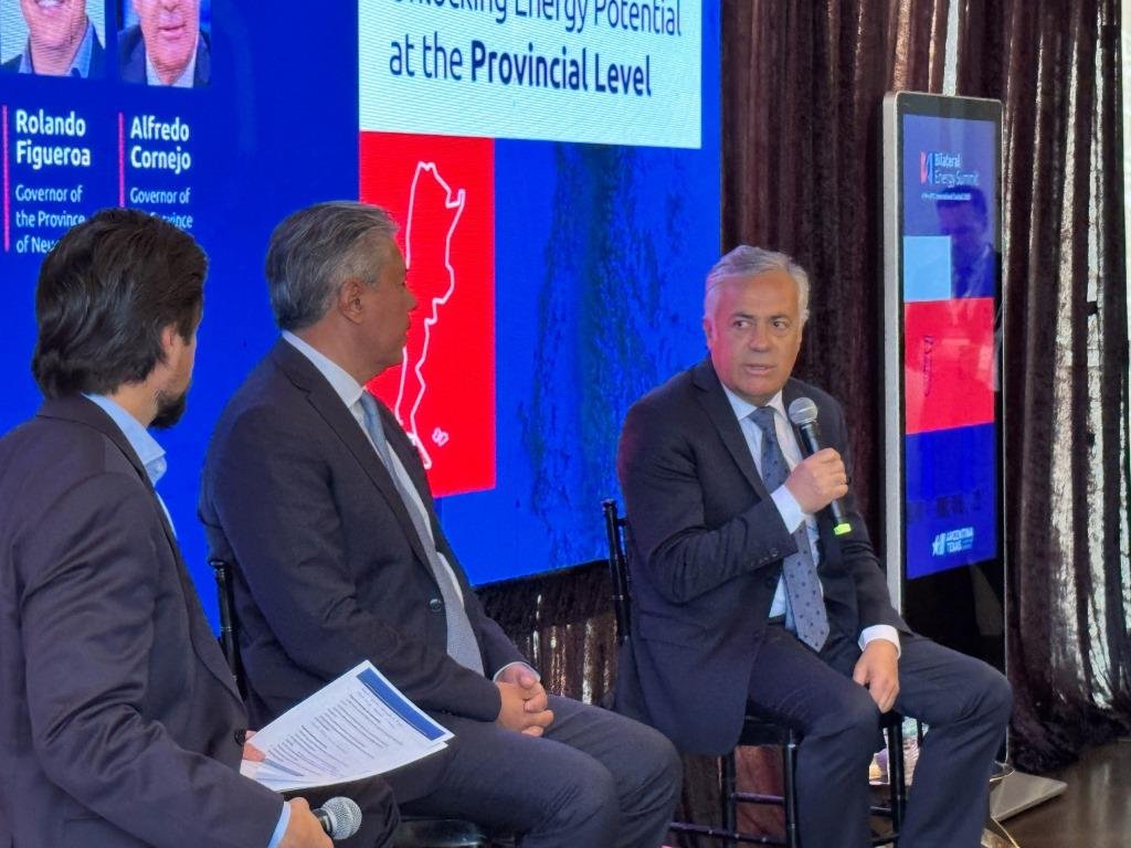 Acompañado por la ministra de Energía y Ambiente, Jimena Latorre, y por el director de Hidrocarburos, Lucas Erio, durante la tarde del domingo, el Gobernador Cornejo compartió el panel junto a su par de Neuquén, Rolando Figueroa. Allí presentó las oportunidades de inversión que ofrece Mendoza en materia energética y subrayó los ejes de su estrategia provincial para potenciar el desarrollo del sector.