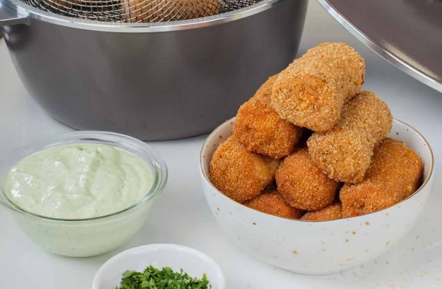 - En una cacerola ESSEN con abundante aceite precalentado a fuego medio, colocá los bastoncitos en el cestillo freidor colgante.