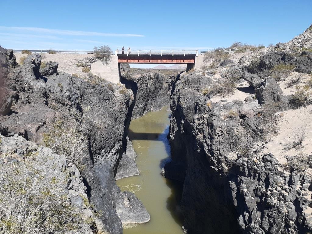 Llegando a La Pasarela encontramos una verdadera obra del capricho natural, por un desfiladero de Basalto el majestuoso Río Grande escurre, esta vez hacia la derecha del camino, la superficie del agua se encuentra a unos 25 metros bajo el paso carretero o de las tablas del antiguo puente de madera muy precario pero que todavía muestra su perfil a pesar de la ausencia de barandas y que desafía a algún valiente que se anime a cruzarlo.