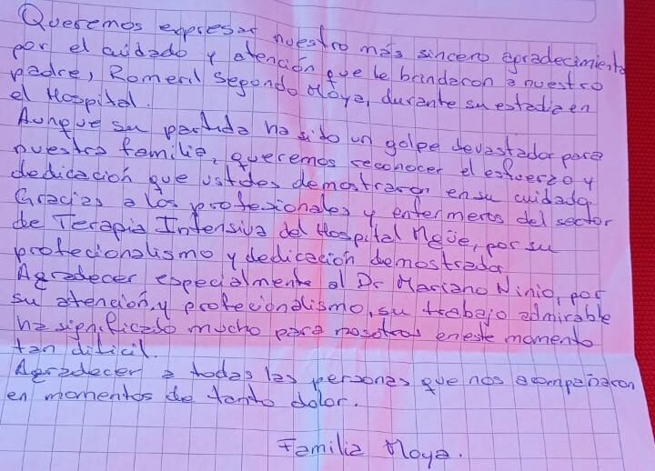 La familia Moya expresó su más sincero agradecimiento al equipo de profesionales y enfermeros de Terapia Intensiva del Hospital Malargüe por la atención y el cuidado brindados a Romeril Segundo Moya durante su internación.