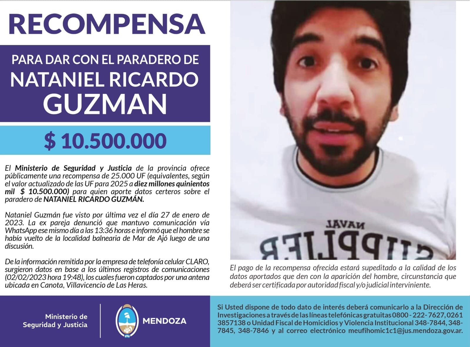 En tanto, Nataniel Ricardo Guzmán fue visto por última vez el 27 de enero de 2023. De acuerdo con la investigación, tras una comunicación con su expareja, sus registros telefónicos posteriores lo ubican en el departamento de Las Heras.