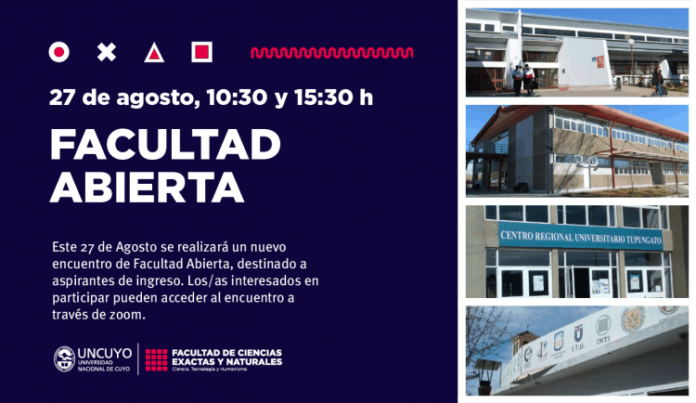 La Facultad de Ciencias Exactas y Naturales informó que este jueves 27 de agosto se realizará un nuevo encuentro de Facultad Abierta, destinado a aspirantes de ingreso.
