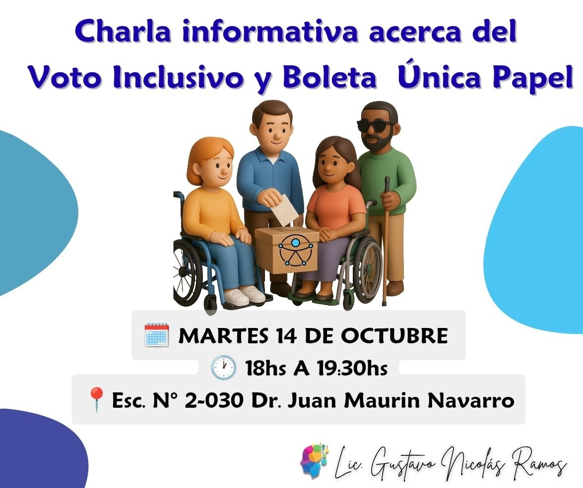 El próximo martes 14 de octubre se realizará una charla sobre voto inclusivo y Boleta Única Papel en la Escuela N° 2-030 Dr. Juan Maurin Navarro. La actividad busca promover la accesibilidad electoral y los derechos de las personas con discapacidad.