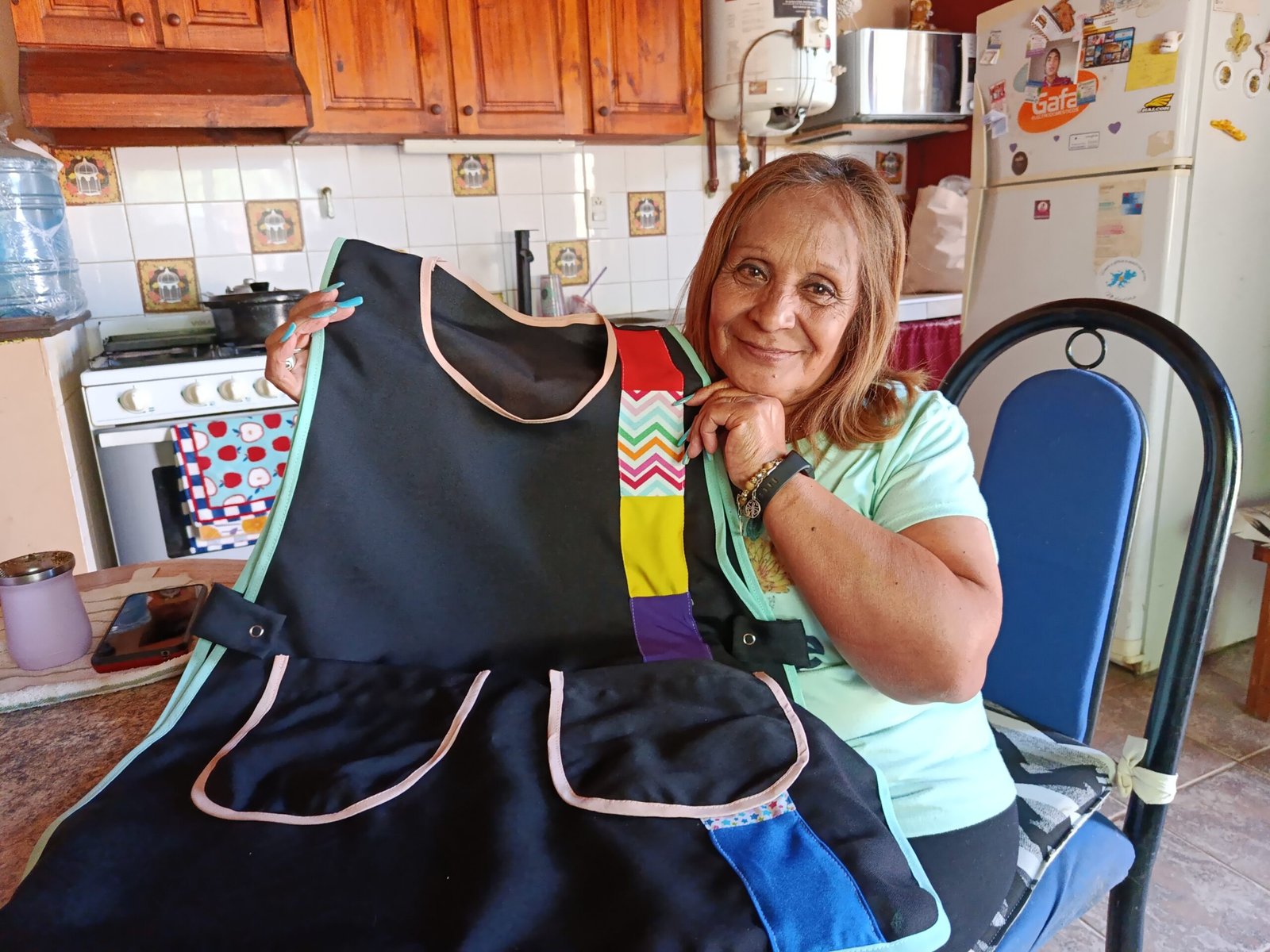 María dejó su trabajo en el hospital de Malargüe cuando Cecilia necesitó mayor dedicación. Hoy sostiene su hogar con sus manos y su oficio: es costurera. En una habitación de su casa, entre telas y máquinas, cose guardapolvos, y también lava acolchados, frazadas, cortinas, forros de sillones. “Lo hago para afuera, para quien necesite. Porque económicamente no alcanza, así que trabajo todo lo que puedo.”