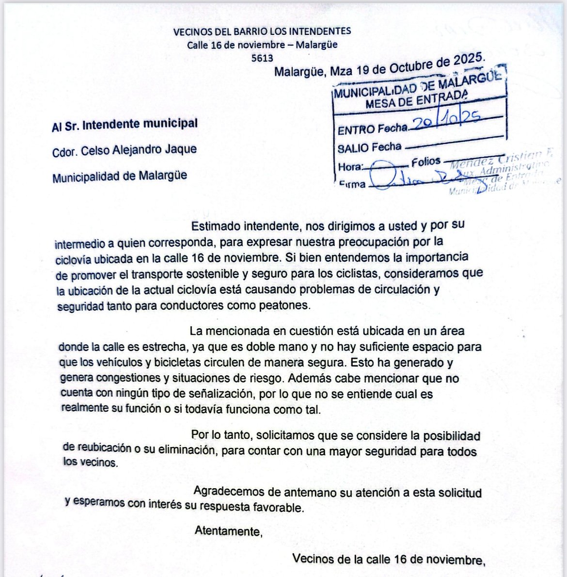 Un grupo de vecinos presentó una nota formal en Mesa de Entradas del Municipio de Malargüe, dirigida al intendente Celso Jaque, solicitando la revisión de la ciclovía ubicada sobre calle 16 de Noviembre.