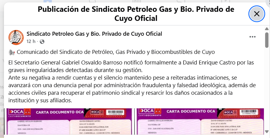 El Sindicato de Petróleo, Gas Privado y Biocombustibles de Cuyo informó que presentará una denuncia penal contra el ex secretario general David Enrique Castro por presunta administración fraudulenta y falsedad ideológica, según se detalla en una carta documento enviada por el actual titular, Gabriel Osvaldo Barroso.