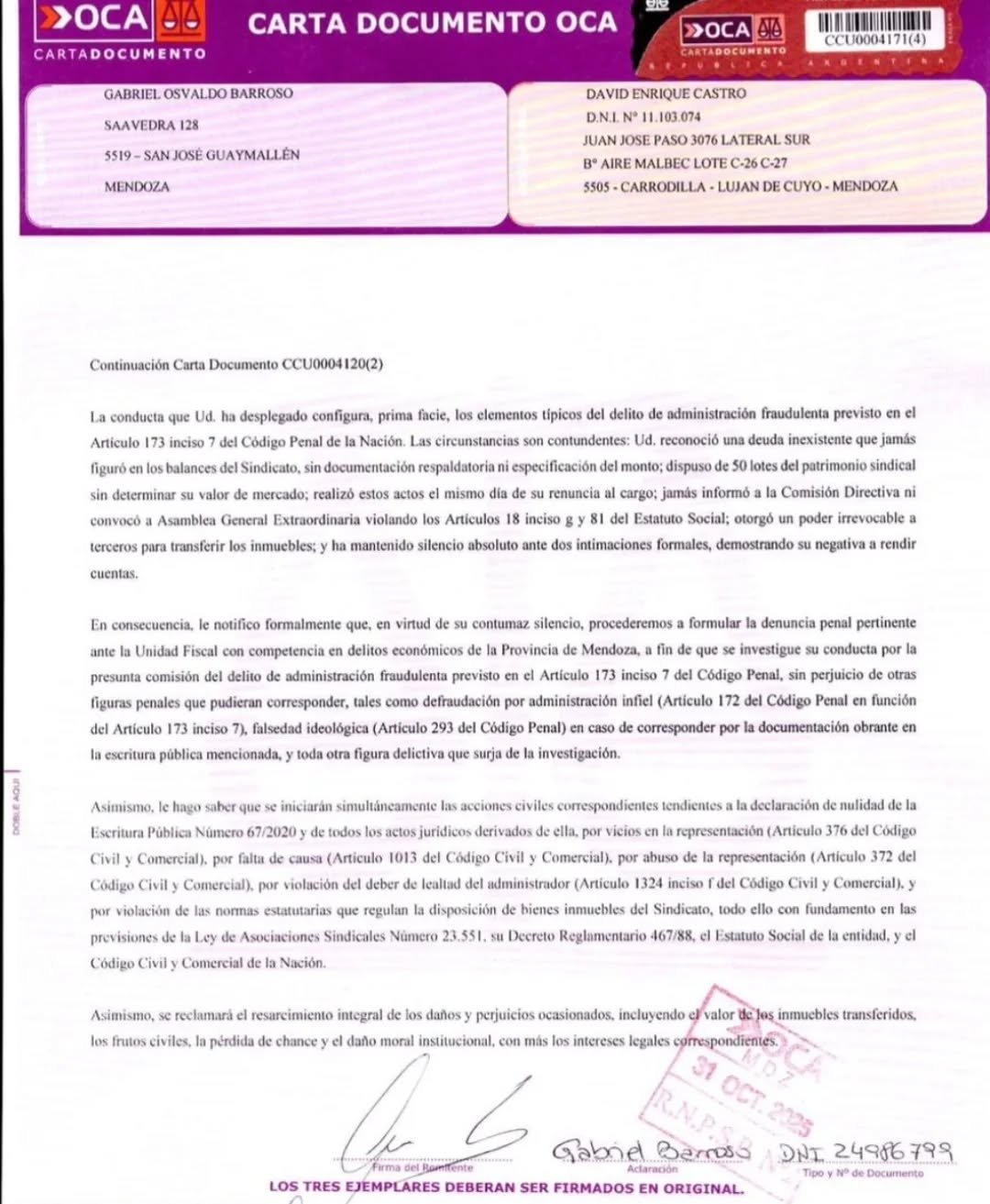En las cartas documento, fechadas entre mayo y octubre de 2025, Barroso señala que durante la gestión de Castro se habrían detectado graves irregularidades en la administración del patrimonio sindical, entre ellas la supuesta entrega de 50 lotes pertenecientes al sindicato a la empresa C&M Argentina SRL, mediante una operación instrumentada en la Escritura Pública N° 67 de septiembre de 2020.