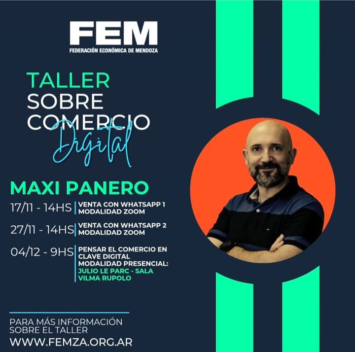 La Federación Económica de Mendoza organiza un ciclo de tres encuentros sobre comercio digital, a cargo del licenciado Maximiliano Panero. Las capacitaciones serán virtuales y presenciales entre el 17 de noviembre y el 4 de diciembre, con inscripción gratuita para comercios de toda la provincia.