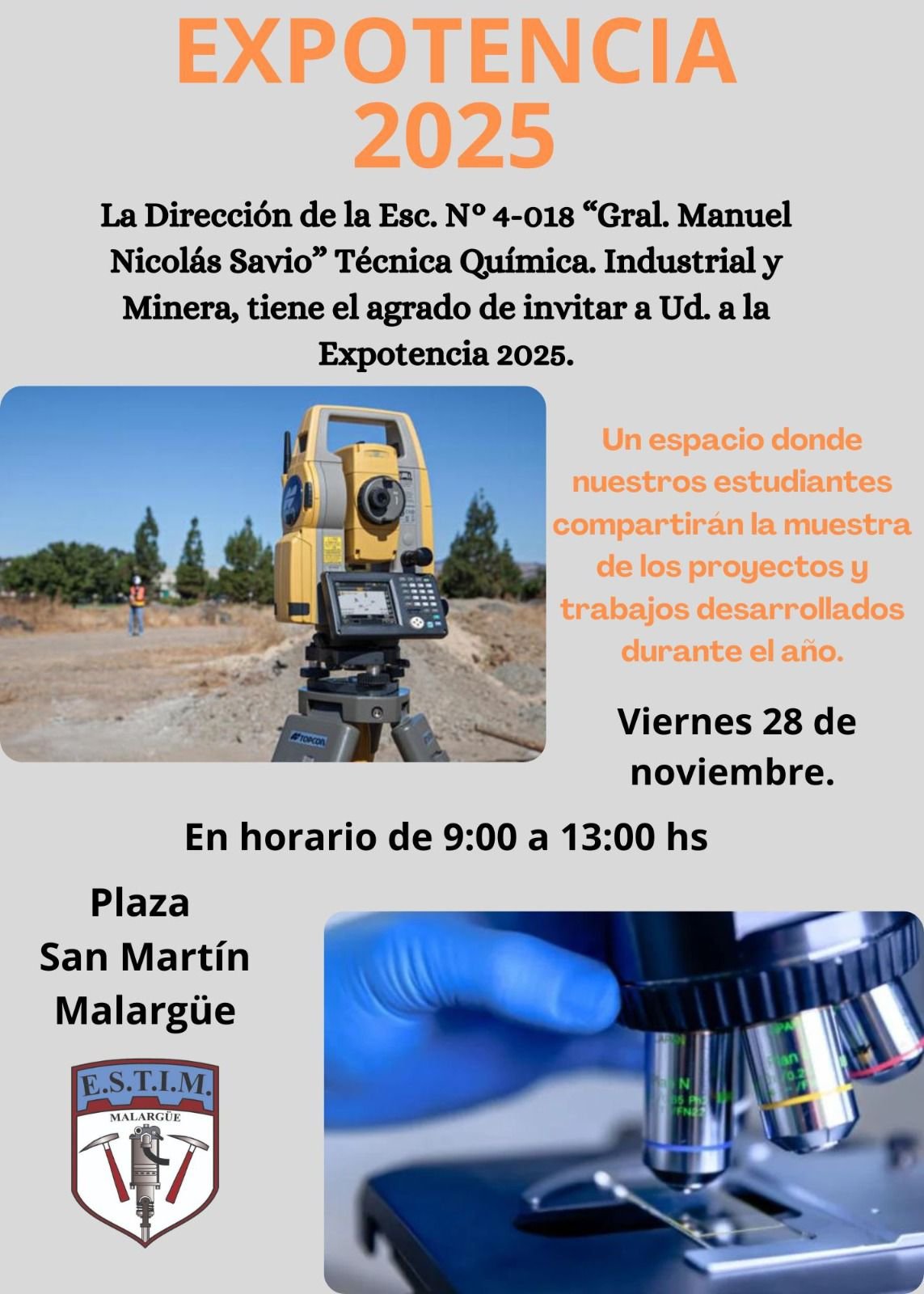 La Escuela 4-018 General Manuel Nicolás Savio invita a toda la comunidad a participar de su Muestra Anual con más de 200 proyectos científicos y tecnológicos formarán parte de Expotencia, donde los estudiantes mostrarán prototipos, ensayos de laboratorio y experiencias de campo vinculadas con energía, minería y procesos industriales. El trabajo integra contenidos de todas las materias mediante la metodología ABP.