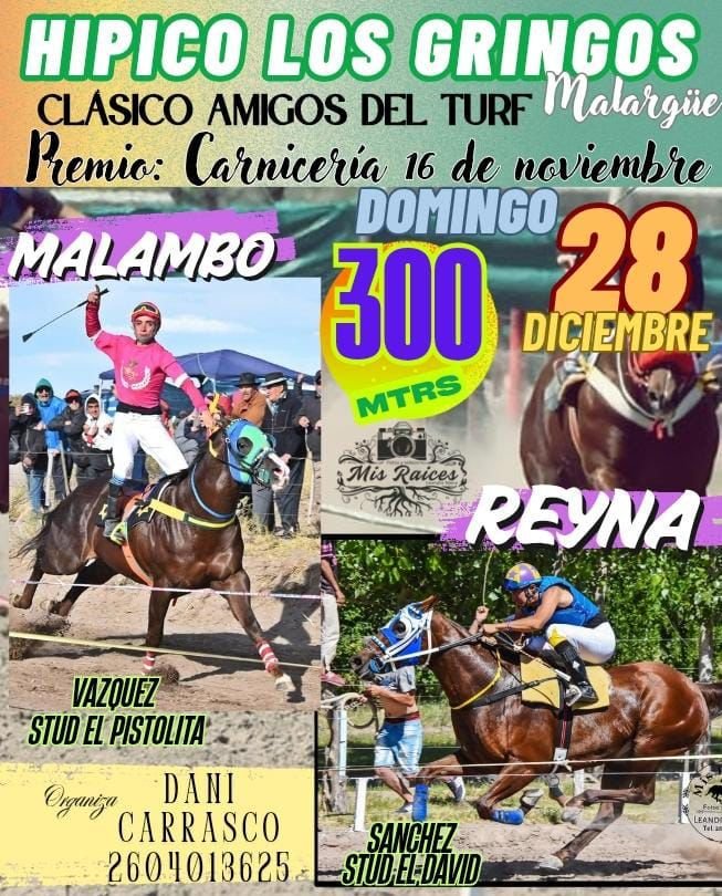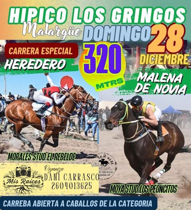 Otra carrera será la que van a protagonizar sobre el 320 metros «Heredero» y «Malena de Novia» de los Stud El Rebelde y Los Peoncitos.