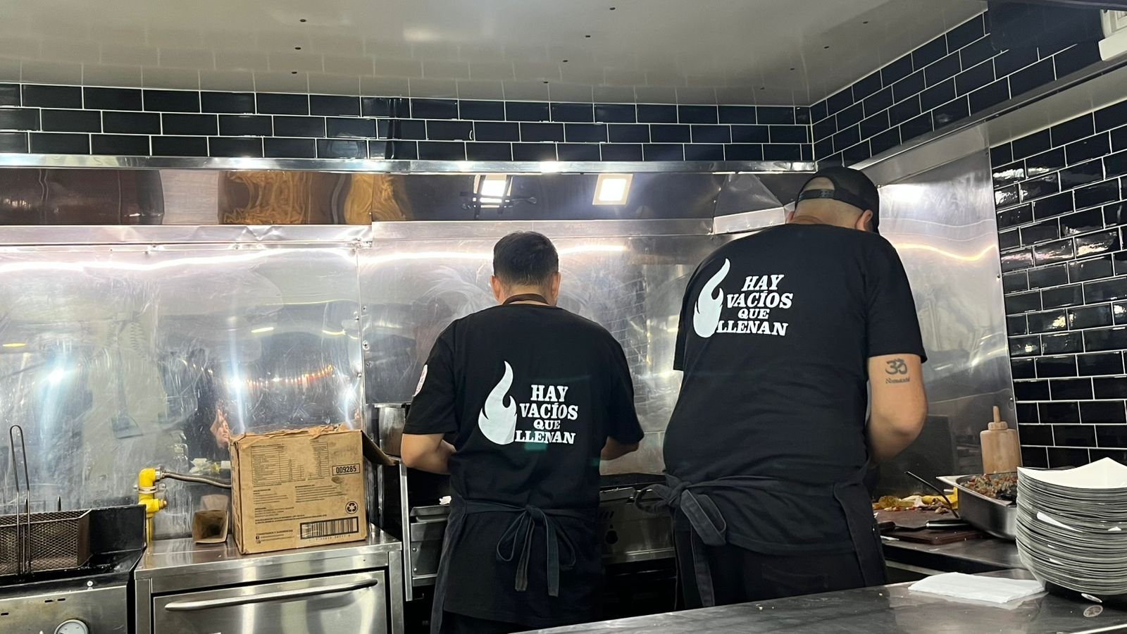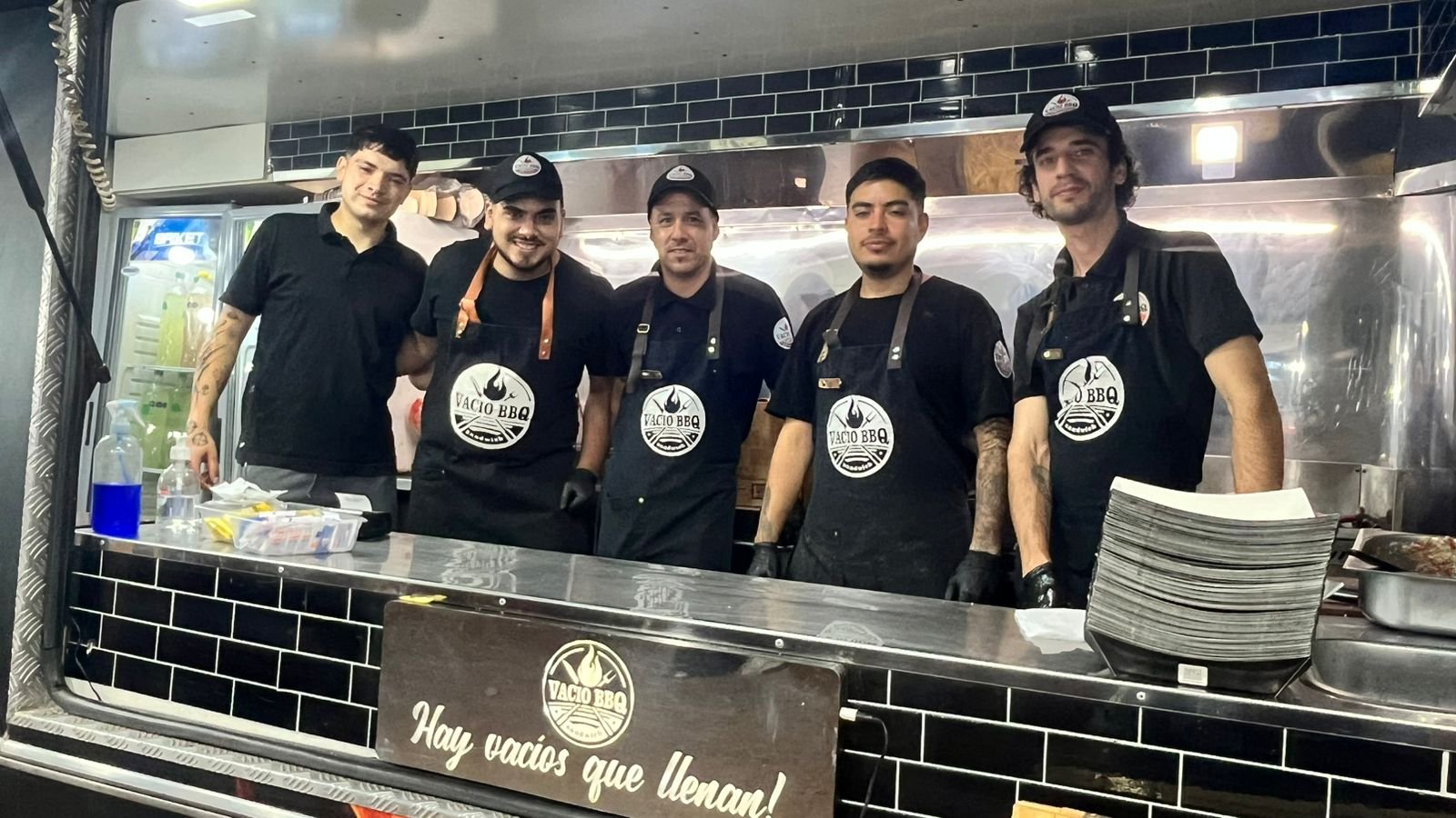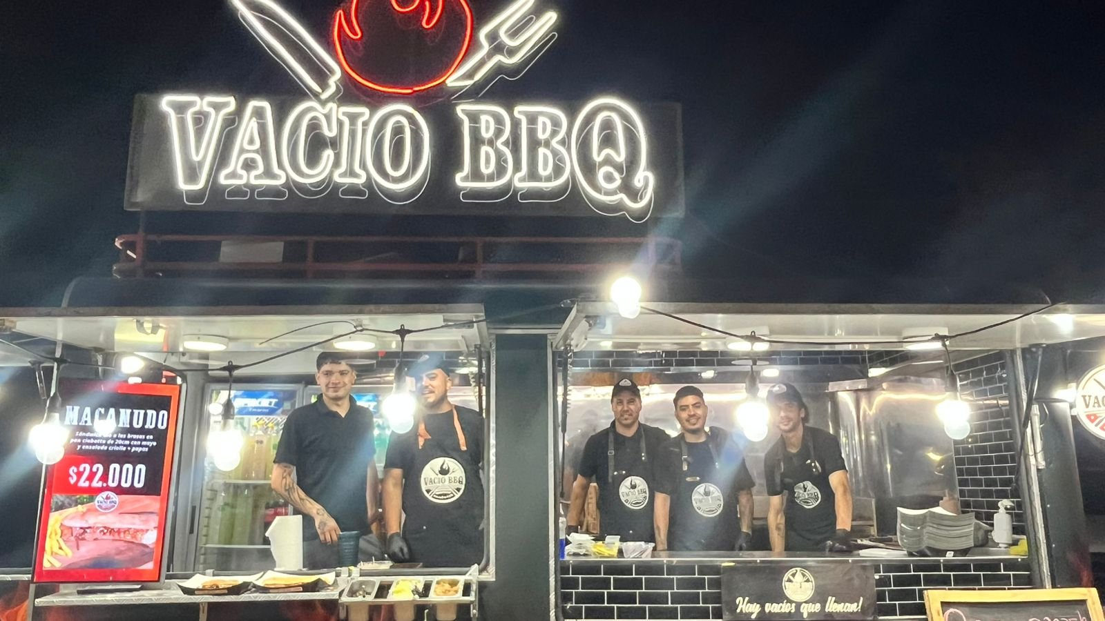 Para orientar al público, el equipo ubicó su puesto “una vez entrando al patio de comidas, a la izquierda”, «donde topa» . Además, señalaron un detalle fácil de reconocer: un food truck con llamas y un cartel luminoso con el nombre Vacío BBQ.