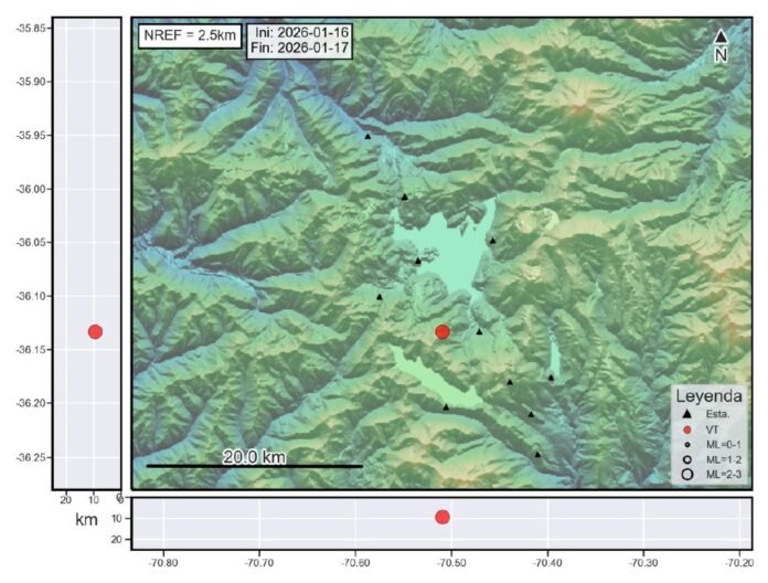 El Servicio Geológico Minero Argentino, a través del Observatorio Argentino de Vigilancia Volcánica, informó que este viernes 16 de enero de 2026 se registró un sismo de tipo volcano-tectónico en el Complejo Volcánico Laguna del Maule, ubicado en la zona limítrofe entre Argentina y Chile.
