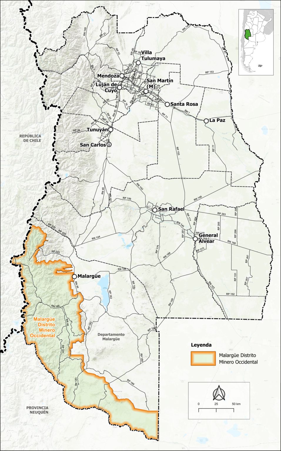 Malargüe Distrito Minero Occidental es un solo distrito, de escala departamental, ubicado en la franja cordillerana y sur de Malargüe.