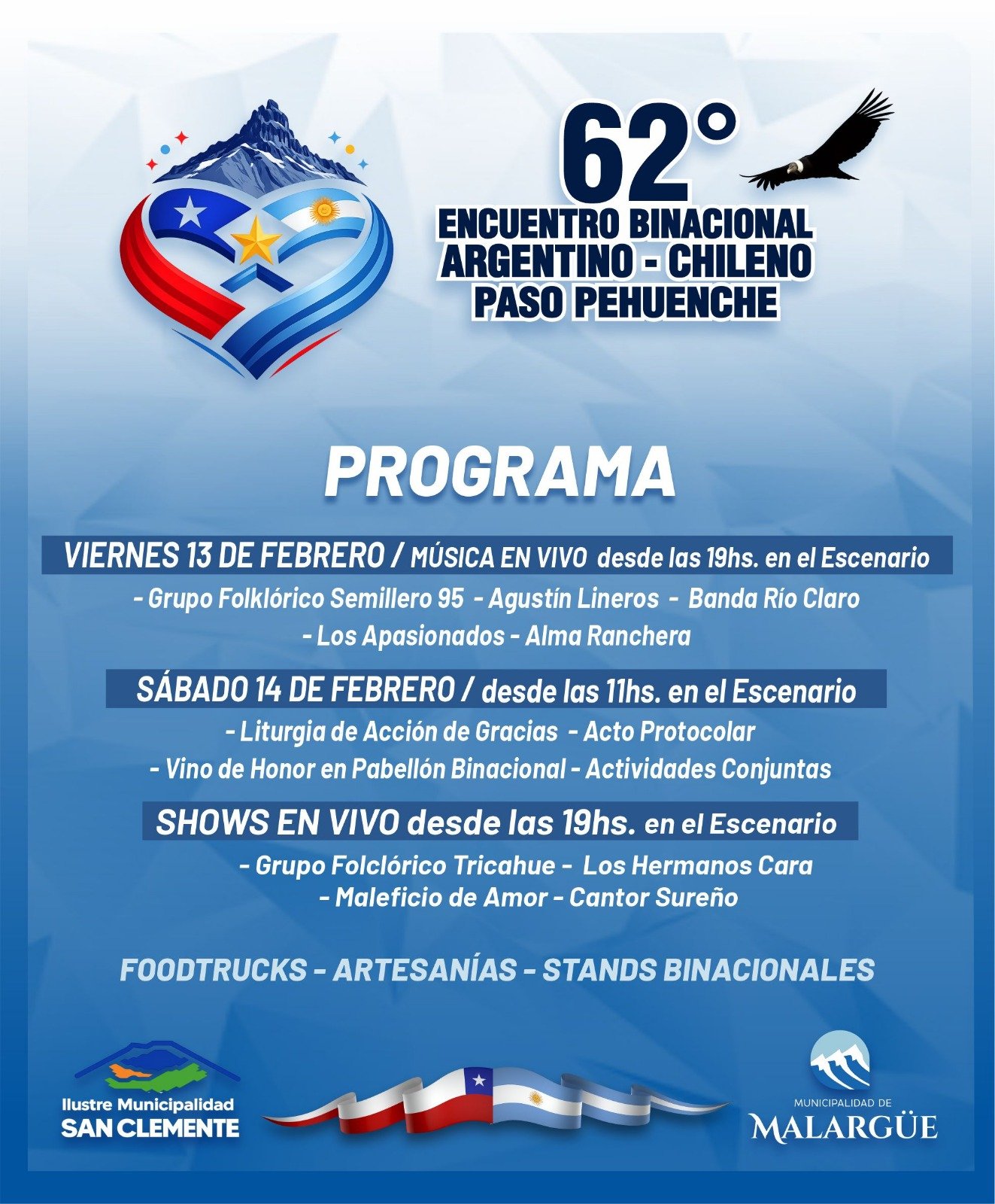 Se confirmó la programación del 62° Encuentro Binacional Argentino – Chileno “Paso Pehuenche”, que se llevará a cabo del 13 al 15 de febrero de 2026 en la Explanada del Cerro Campanario, con espectáculos, actos protocolares y espacios gastronómicos para toda la comunidad.