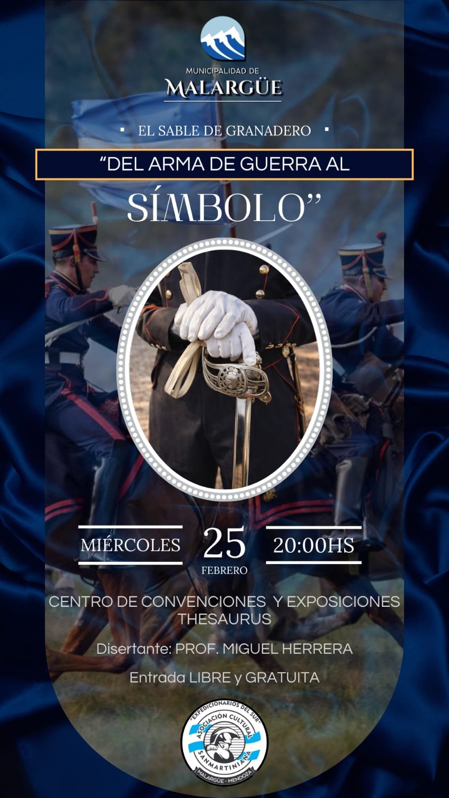 La Municipalidad de Malargüe difundió la realización de una charla titulada “El sable de granadero”, prevista para este miércoles 25 de febrero a las 20:00 en el Centro de Convenciones y Exposiciones Thesaurus, con entrada libre y gratuita. La disertación estará a cargo del profesor Miguel Herrera.